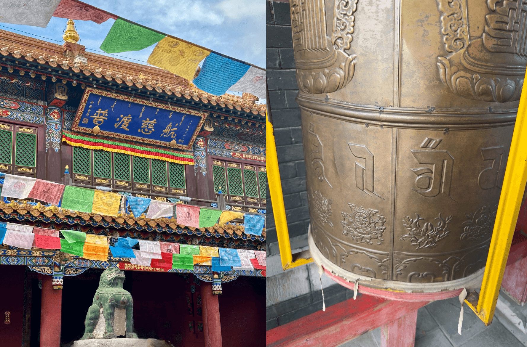 内蒙则是藏传佛教为主流,主要是藏传佛教中的格鲁派(黄教)。经书以藏文书写,而内蒙又同时出现汉字和蒙文,所以在内蒙的佛寺里会同时有三种文字。