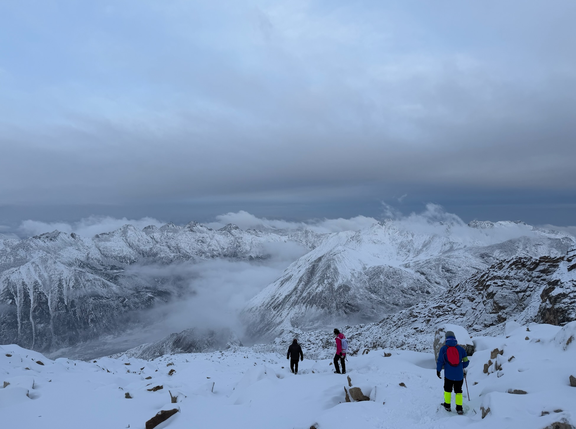 上身:速干+抓绒+冲锋衣,关键是控制自己的排汗,千万不能汗湿,这样会失温,所以感觉热的时候,可以打开冲锋衣的腋窝拉链控制透风。排骨羽绒服带了但这次没用上,以防万一还是要带的