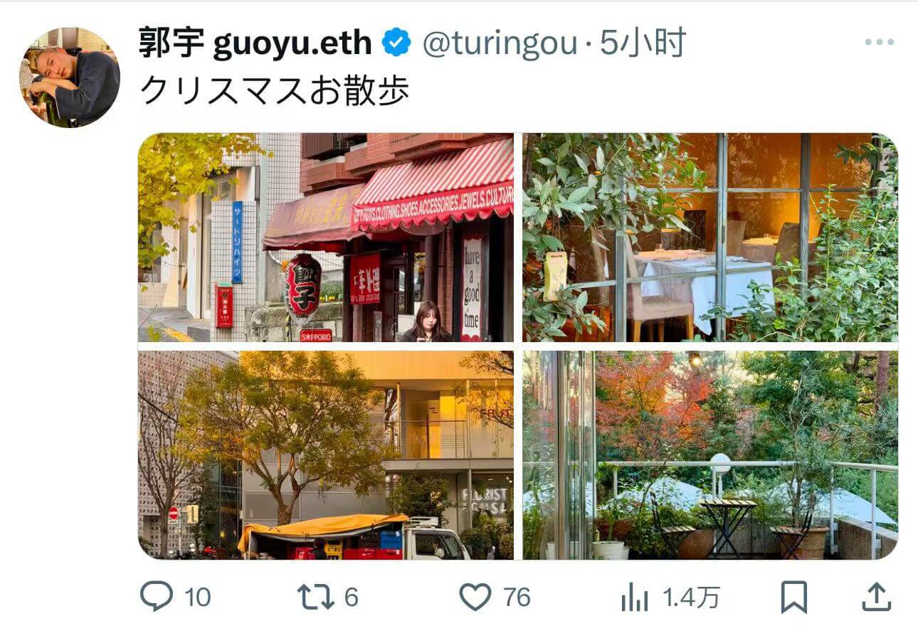 于是背完平假名和片假名后,平时网上冲浪一看到日语假名,我就会试着读一读。比如下面这条推文,看汉字只看懂“散步”,应该就是普通的散步照片吧。但我把句子一念,“クリスマス”发音 ku ri su ma su,原来是 christmas,圣诞散步的意思啊,信息量一下子丰富了很多。